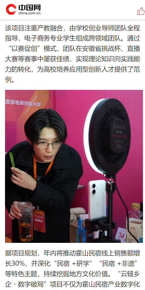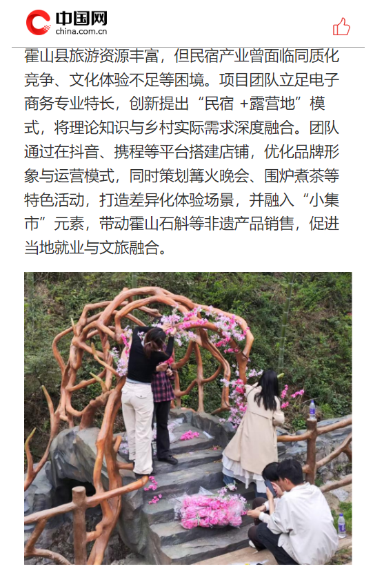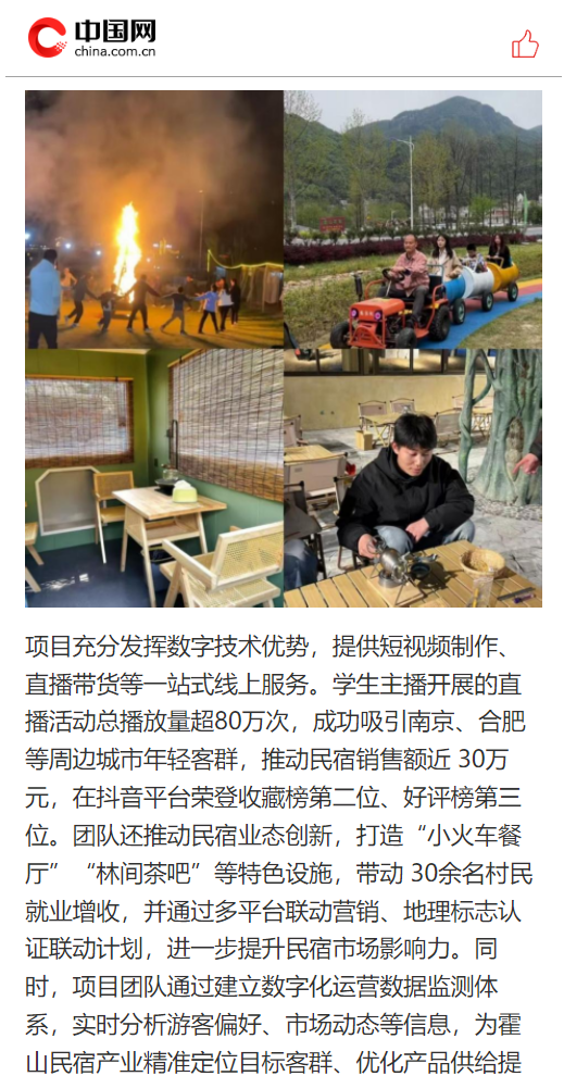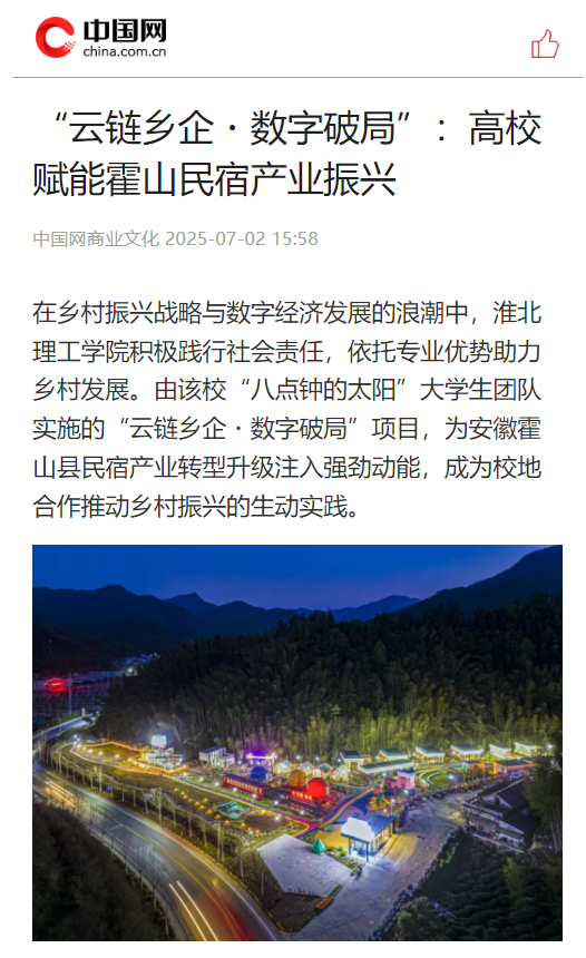 在乡村振兴战略与数字经济发展的浪潮中,beat365英国官方网站积极践行社会责任,依托专业优势助力乡村发展。由该校“八点钟的太阳”大学生团队实施的“云链乡企・数字破局”项目,为安徽霍山县民宿产业转型升级注入强劲动能,成为校地合作推动乡村振兴的生动实践。对此,中国网进行了报道: