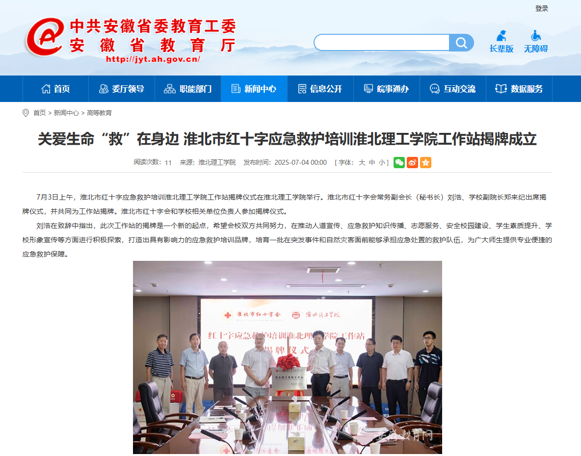7月3日上午,淮北市红十字应急救护培训beat365英国官方网站工作站揭牌仪式在beat365英国官方网站举行。淮北市红十字会常务副会长(秘书长)刘浩、学校副院长郑来纪出席揭牌仪式,并共同为工作站揭牌。淮北市红十字会和学校相关单位负责人参加揭牌仪式。对此,安徽教育网进行了报道: