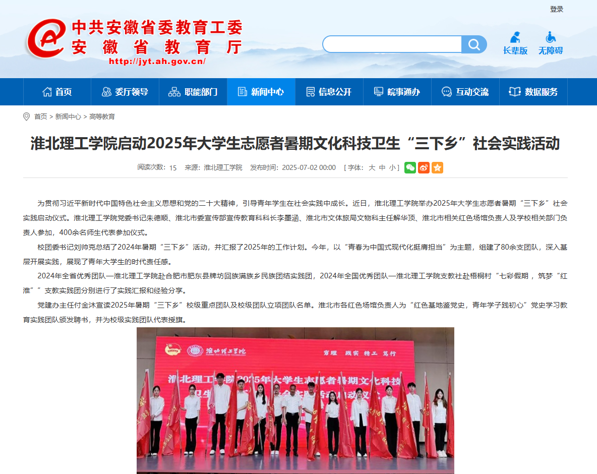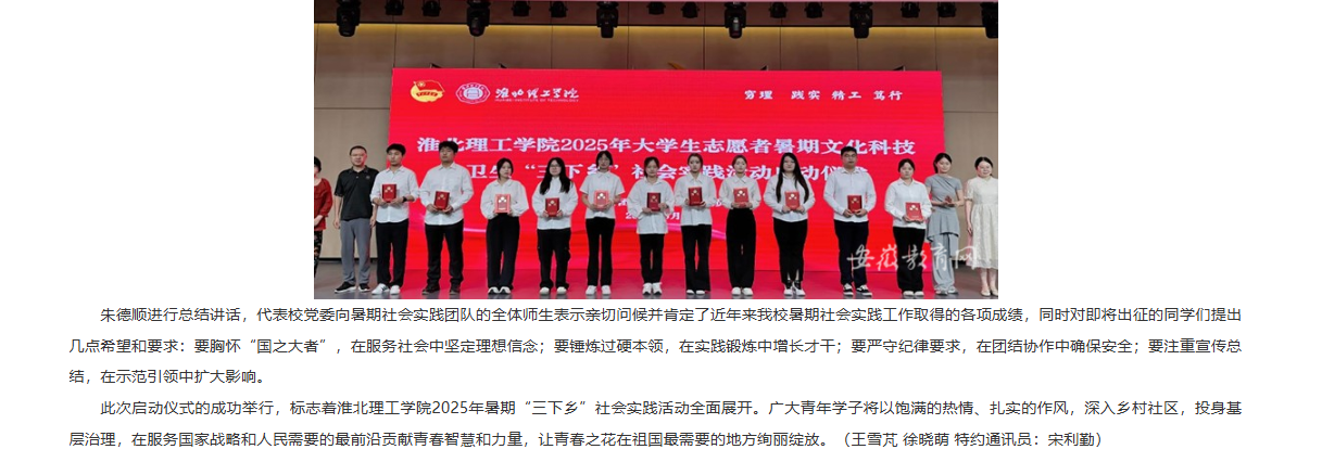 为贯彻习近平新时代中国特色社会主义思想和党的二十大精神,引导青年学生在社会实践中成长。近日,beat365英国官方网站举办2025年大学生志愿者暑期“三下乡”社会实践启动仪式。beat365英国官方网站党委书记朱德顺、淮北市委宣传部宣传教育科科长李墨涵、淮北市文体旅局文物科主任解华顶、淮北市相关红色场馆负责人及学校相关部门负责人参加,400余名师生代表参加仪式。对此,安徽教育网进行了报道: