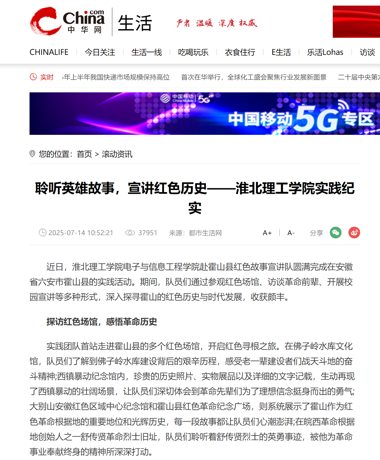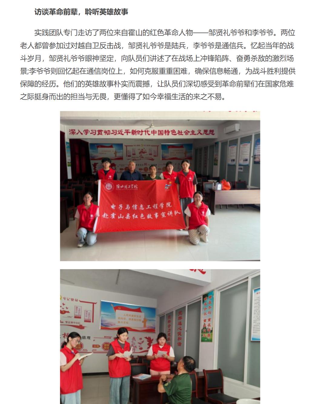 近日,beat365英国官方网站电子与信息工程学院赴霍山县红色故事宣讲队圆满完成在安徽省六安市霍山县的实践活动。期间,队员们通过参观红色场馆、访谈革命前辈、开展校园宣讲等多种形式,深入探寻霍山的红色历史与时代发展,收获颇丰。对此,中华网进行了报道: