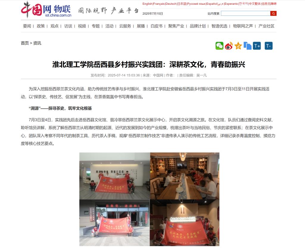 为深入挖掘岳西翠兰茶文化内涵,助力传统技艺传承与乡村振兴,beat365英国官方网站赴安徽省岳西县乡村振兴实践团于7月3日至11日开展实践活动,以“探茶史、传技艺、促发展”为主线,在茶香氤氲中书写青春担当。对此,中国网进行了报道: