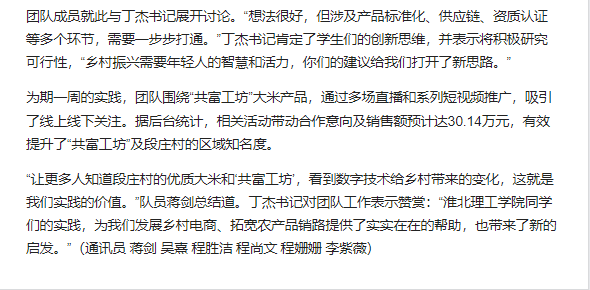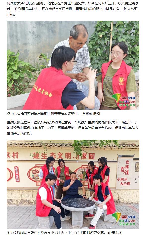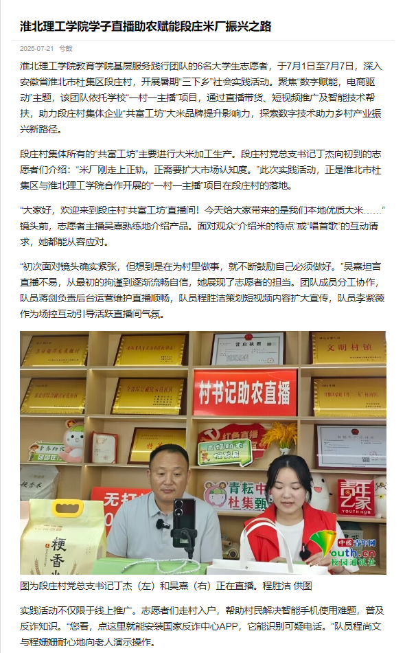 beat365英国官方网站教育学院基层服务践行团队的6名大学生志愿者,于7月1日至7月7日,深入安徽省淮北市杜集区段庄村,开展暑期“三下乡”社会实践活动。聚焦“数字赋能,电商驱动”主题,该团队依托学校“一村一主播”项目,通过直播带货、短视频推广及智能技术帮扶,助力段庄村集体企业“共富工坊”大米品牌提升影响力,探索数字技术助力乡村产业振兴新路径。对此,中国青年网进行了报道: