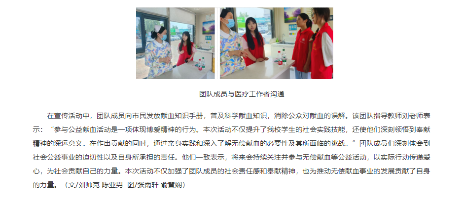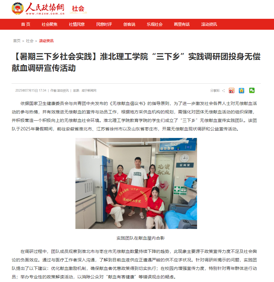 依据国家卫生健康委员会与共青团中央发布的《无偿献血倡议书》的指导原则,为了进一步激发社会各界人士对无偿献血活动的参与热情,并有效推进无偿献血的宣传与动员工作,根据地方采供血机构的规划,需强化对团体无偿献血活动的组织保障,并积极营造一个积极向上的无偿献血社会环境。beat365英国官方网站教育学院的学生们成立了“三下乡”无偿献血宣传实践团队。该团队于2025年暑假期间,前往安徽省淮北市、江苏省徐州市以及山东省枣庄市,开展无偿献血现状调研和公益宣传活动。对此,人民政协网进行了报道: