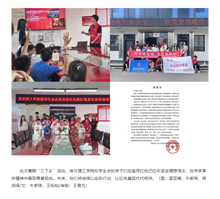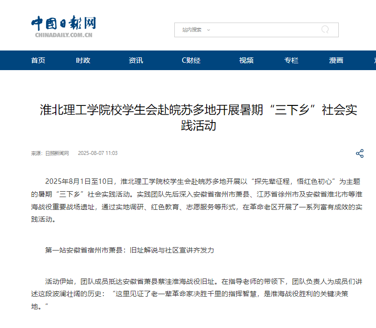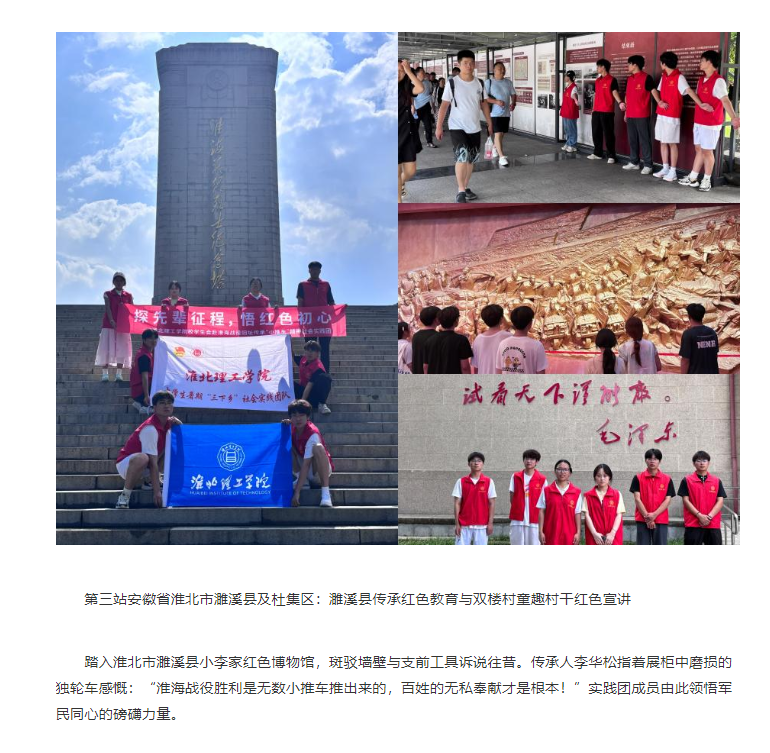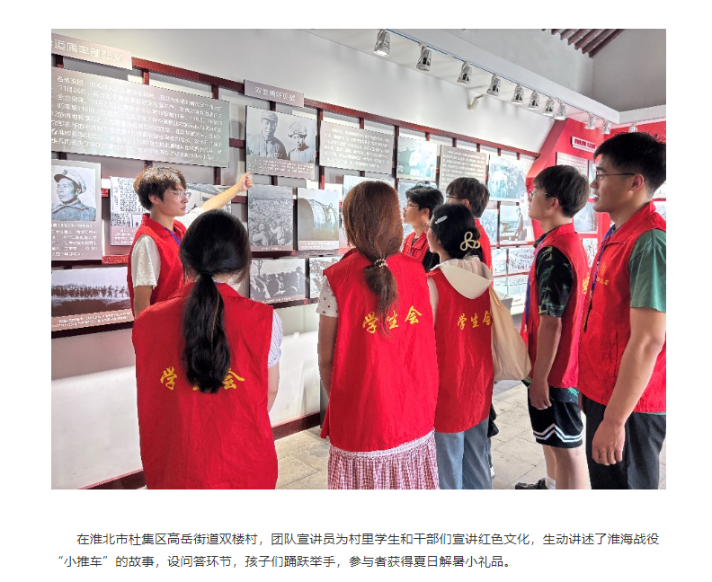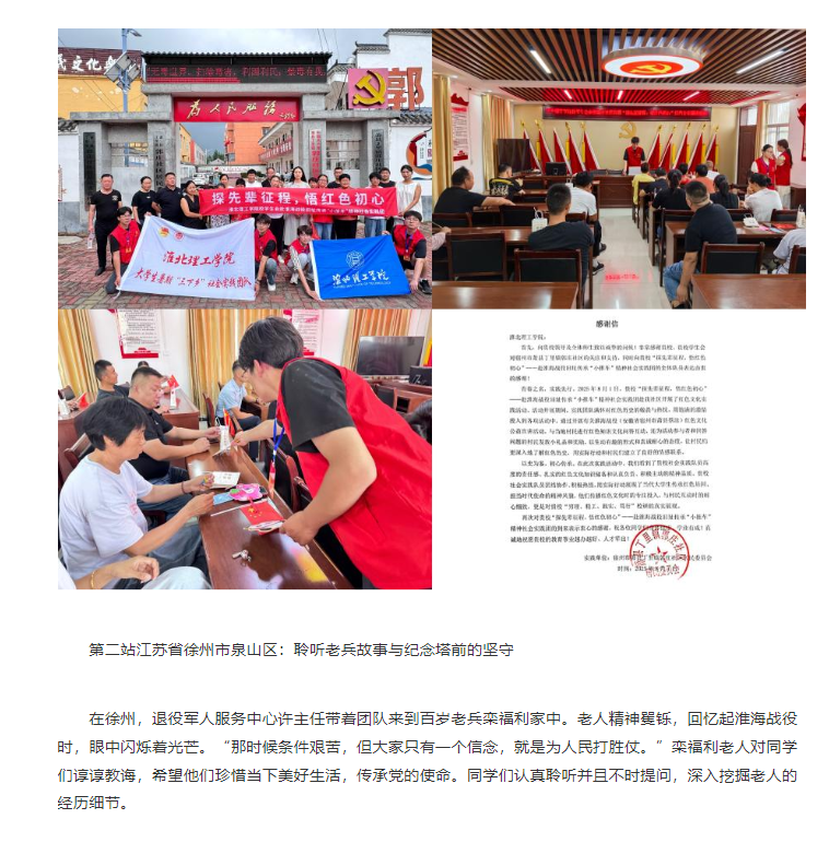 2025年8月1日至10日,beat365英国官方网站校学生会赴皖苏多地开展以“探先辈征程,悟红色初心”为主题的暑期“三下乡”社会实践活动。实践团队先后深入安徽省宿州市萧县、江苏省徐州市及安徽省淮北市等淮海战役重要战场遗址,通过实地调研、红色教育、志愿服务等形式,在革命老区开展了一系列富有成效的实践活动。对此,中国日报网进行了报道: