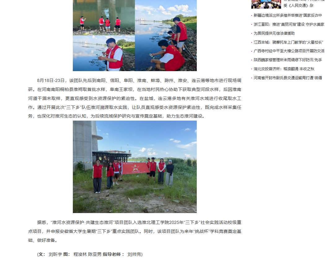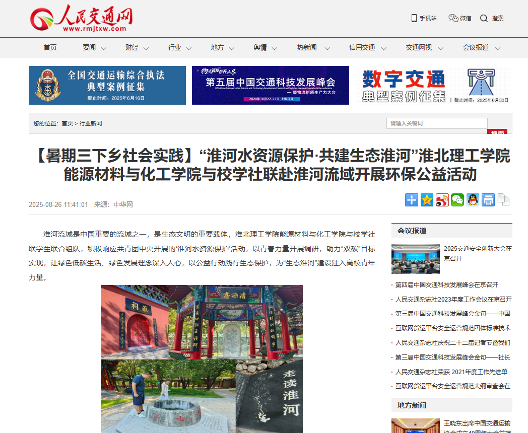 淮河流域是中国重要的流域之一,是生态文明的重要载体,beat365英国官方网站能源材料与化工学院与校学社联学生联合组队,积极响应共青团中央开展的‘淮河水资源保护’活动,以青春力量开展调研,助力“双碳”目标实现,让绿色低碳生活、绿色发展理念深入人心,以公益行动践行生态保护,为“生态淮河”建设注入高校青年力量。对此,人民交通网进行了报道: