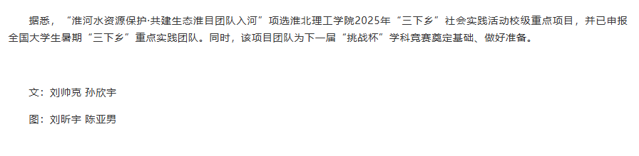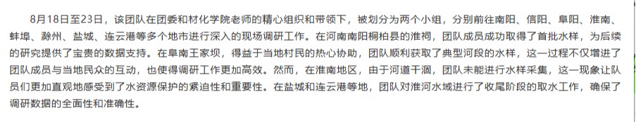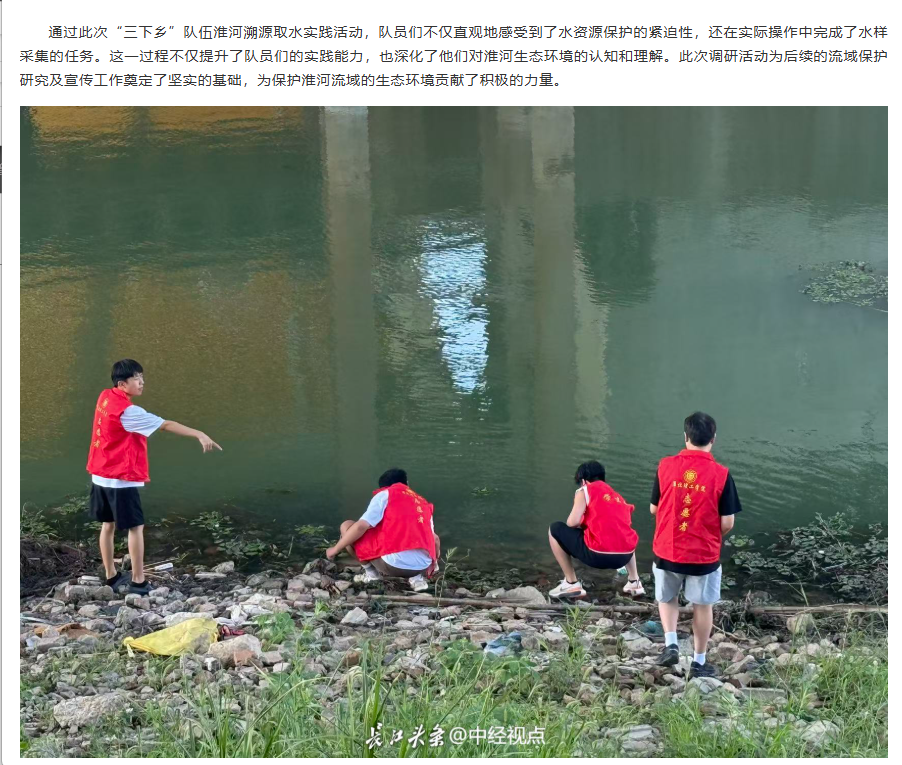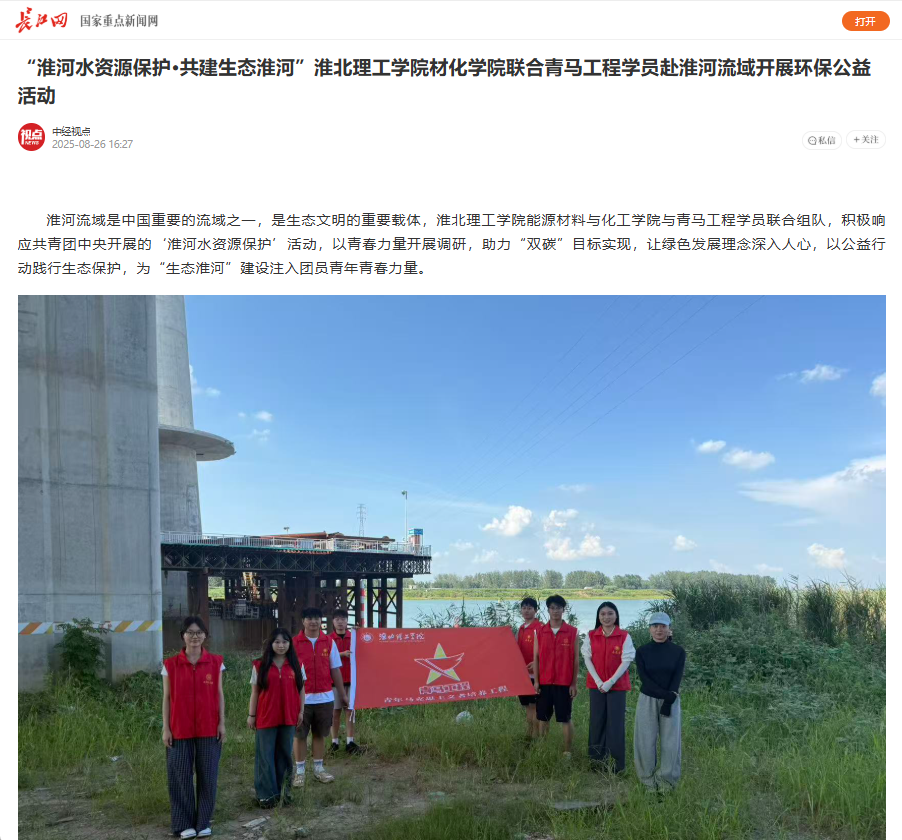 淮河流域是中国重要的流域之一,是生态文明的重要载体,beat365英国官方网站能源材料与化工学院与青马工程学员联合组队,积极响应共青团中央开展的‘淮河水资源保护’活动,以青春力量开展调研,助力“双碳”目标实现,让绿色发展理念深入人心,以公益行动践行生态保护,为“生态淮河”建设注入团员青年青春力量。对此,长江网进行了报道: