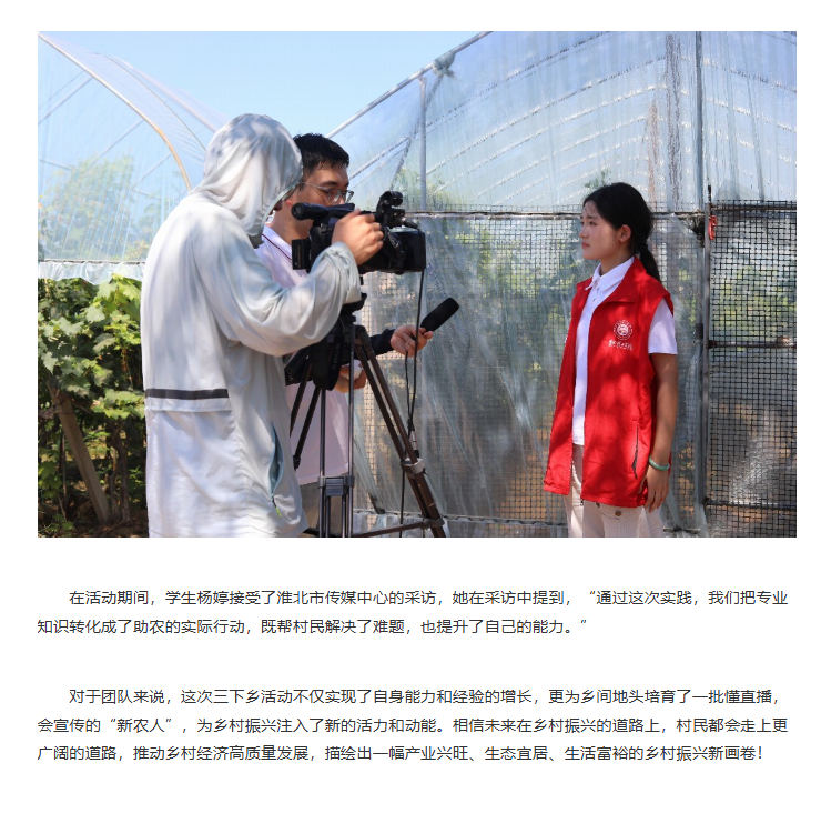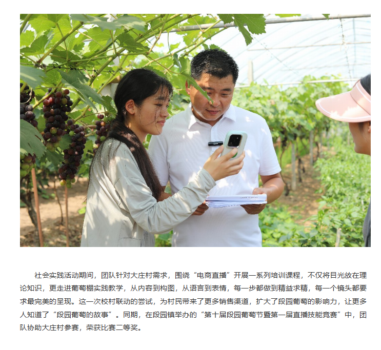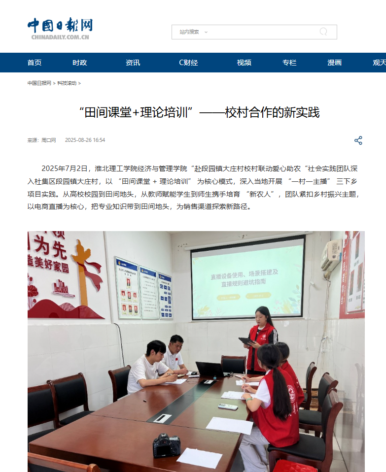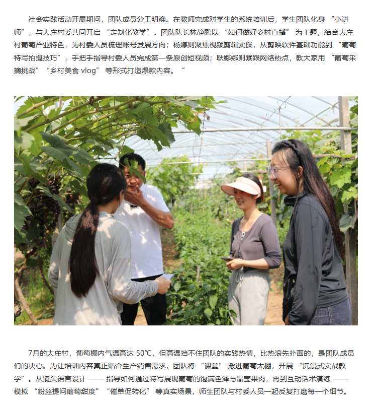 2025年7月2日,beat365英国官方网站经济与管理学院“赴段园镇大庄村校村联动爱心助农“社会实践团队深入杜集区段园镇大庄村,以 “田间课堂 + 理论培训” 为核心模式,深入当地开展 “一村一主播” 三下乡项目实践。从高校校园到田间地头,从教师赋能学生到师生携手培育 “新农人”,团队紧扣乡村振兴主题,以电商直播为核心,把专业知识带到田间地头,为销售渠道探索新路径。对此,中国日报网进行了报道: