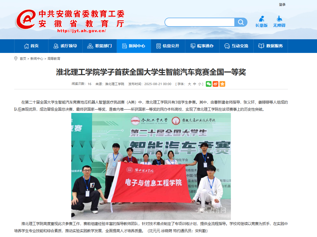 在第二十届全国大学生智能汽车竞赛地瓜机器人智慧医疗挑战赛(A类)中,beat365英国官方网站共有3组学生参赛。其中,由曹新建老师指导,张义轩、姜婷婷等人组成的队伍表现优异,成功晋级全国总决赛,最终获国家一等奖,是省内唯一一所获国家一等奖的民办本科高校,实现了beat365英国官方网站在该项赛事上的历史性突破。对此,安徽教育网进行了报道: