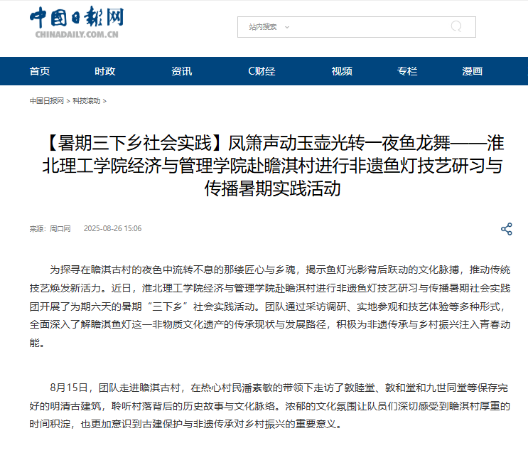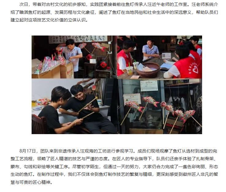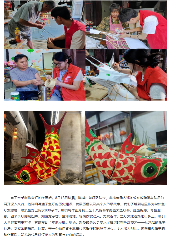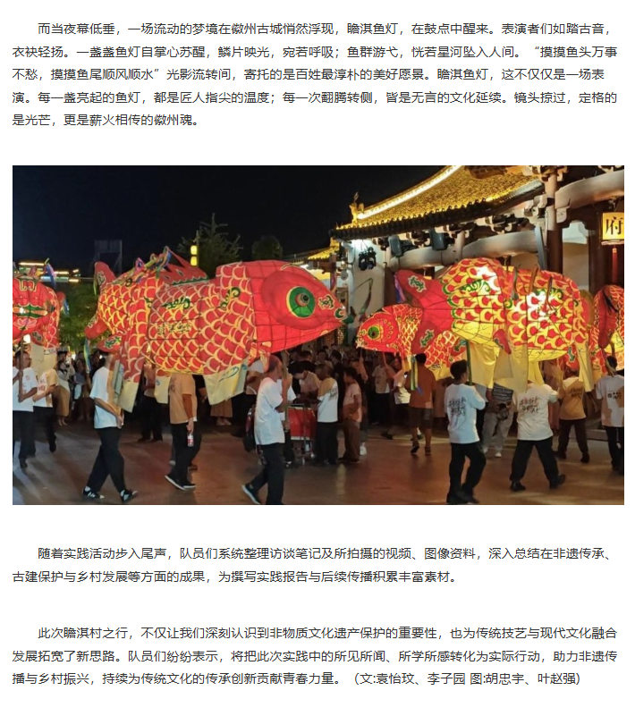 为探寻在瞻淇古村的夜色中流转不息的那缕匠心与乡魂,揭示鱼灯光影背后跃动的文化脉搏,推动传统技艺焕发新活力。近日,beat365英国官方网站经济与管理学院赴瞻淇村进行非遗鱼灯技艺研习与传播暑期社会实践团开展了为期六天的暑期“三下乡”社会实践活动。团队通过采访调研、实地参观和技艺体验等多种形式,全面深入了解瞻淇鱼灯这一非物质文化遗产的传承现状与发展路径,积极为非遗传承与乡村振兴注入青春动能。对此,中国日报网进行了报道: