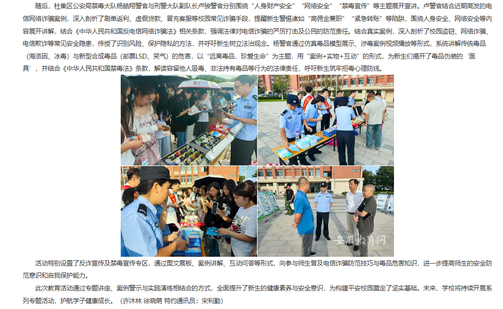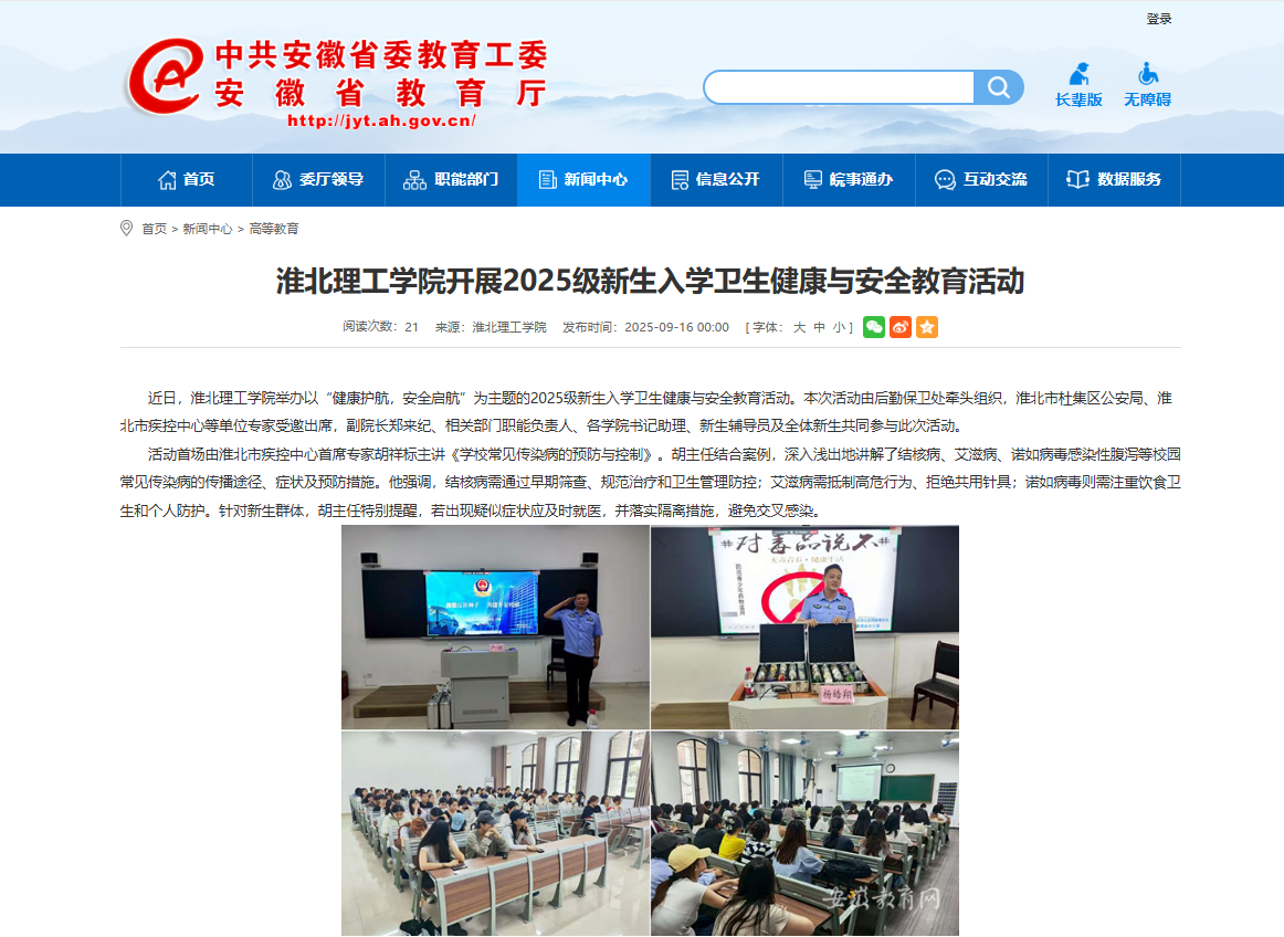 近日,beat365英国官方网站举办以“健康护航,安全启航”为主题的2025级新生入学卫生健康与安全教育活动。本次活动由后勤保卫处牵头组织,淮北市杜集区公安局、淮北市疾控中心等单位专家受邀出席,副院长郑来纪、相关部门职能负责人、各学院书记助理、新生辅导员及全体新生共同参与此次活动。对此,安徽教育网进行了报道: