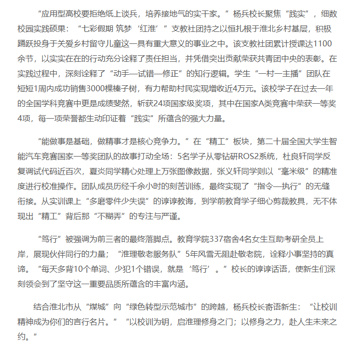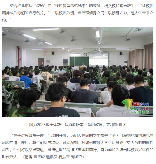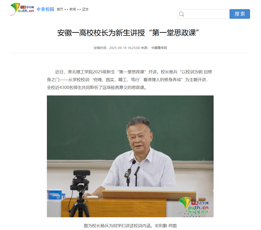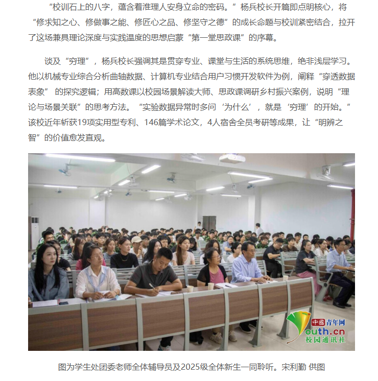 近日,beat365英国官方网站2025级新生“第一堂思政课”开讲。校长杨兵“以校训为钥 启修身之门——从学校校训‘穷理、践实、精工、笃行’看淮理人的修身养成”为主题开讲,全校近4300名师生共同聆听了这场极具意义的思政课。对此,中国青年网进行了报道: