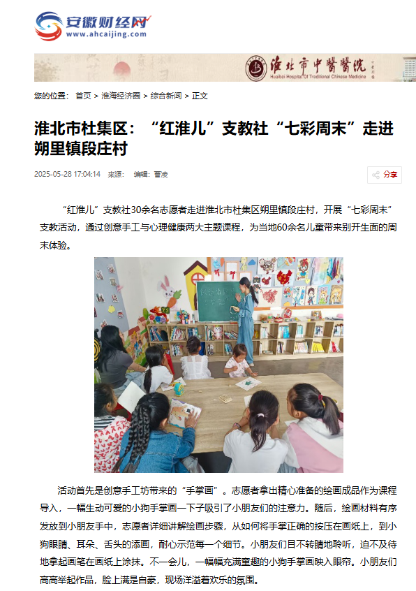 “红淮儿”支教社30余名志愿者走进淮北市杜集区朔里镇段庄村,开展“七彩周末”支教活动,通过创意手工与心理健康两大主题课程,为当地60余名儿童带来别开生面的周末体验。对此,安徽财经网进行了报道: