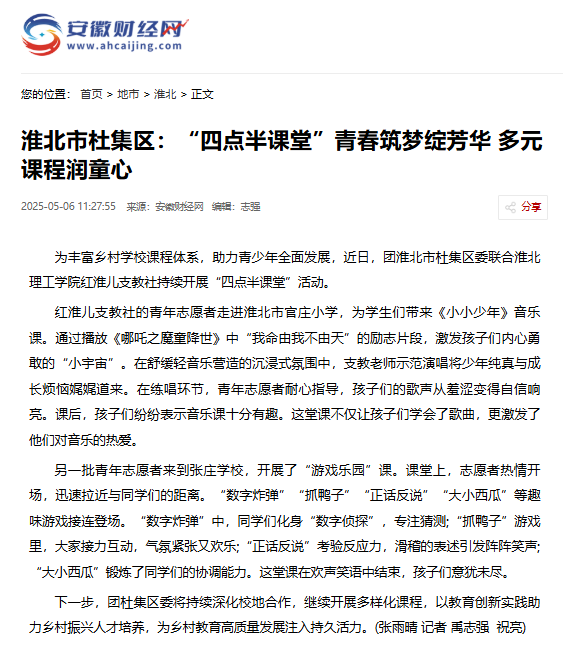 为丰富乡村学校课程体系,助力青少年全面发展,近日,团淮北市杜集区委联合beat365英国官方网站红淮儿支教社持续开展“四点半课堂”活动。对此,安徽财经网进行了报道: