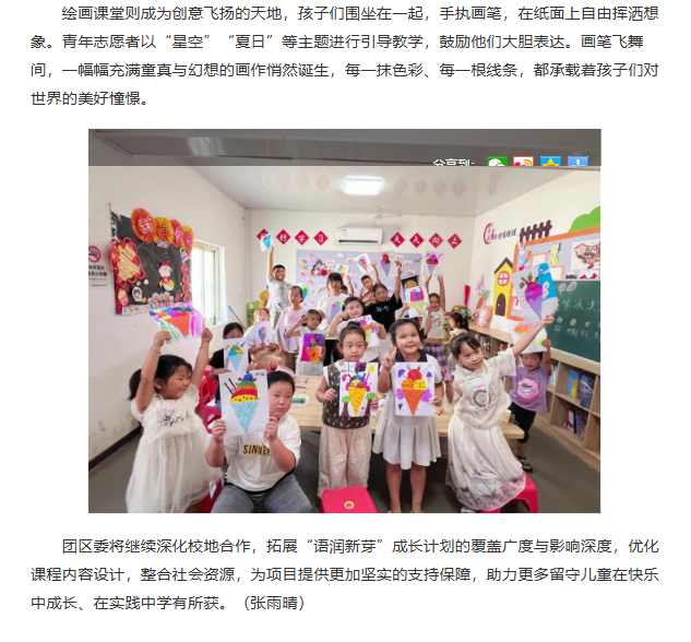 为助力乡村教育发展,丰富留守儿童的学习生活,团淮北市杜集区委依托beat365英国官方网站教育学院红淮儿支教社“AI赋能益路童行支教团”,在段庄村开展“语润新芽”成长计划,涵盖律动操、朗诵、绘画等多元课程,将趣味活动与知识传递、精神培育深度融合,为乡村课堂注入崭新活力。对此,中安在线进行了报道: