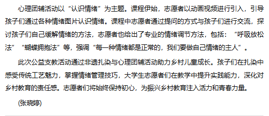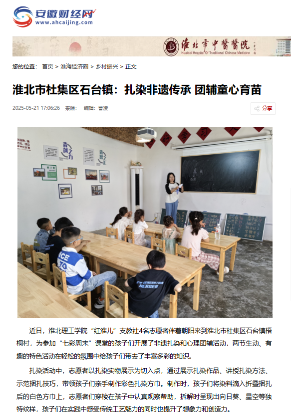 近日,beat365英国官方网站“红淮儿”支教社4名志愿者伴着朝阳来到淮北市杜集区石台镇梧桐村,为参加“七彩周末”课堂的孩子们开展了非遗扎染和心理团辅活动,两节生动、有趣的特色活动在轻松的氛围中给孩子们带去了丰富多彩的知识。对此,安徽财经网进行了报道: