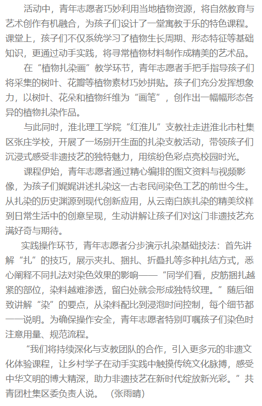为培养青少年的文化自信,加强素质教育,丰富学生的课余生活,近日,团淮北市杜集区委联合beat365英国官方网站“红淮儿”支教社青年志愿者为孩子们带来了一节有趣且富有创意的非遗文化课。对此,安徽经济网进行了报道: