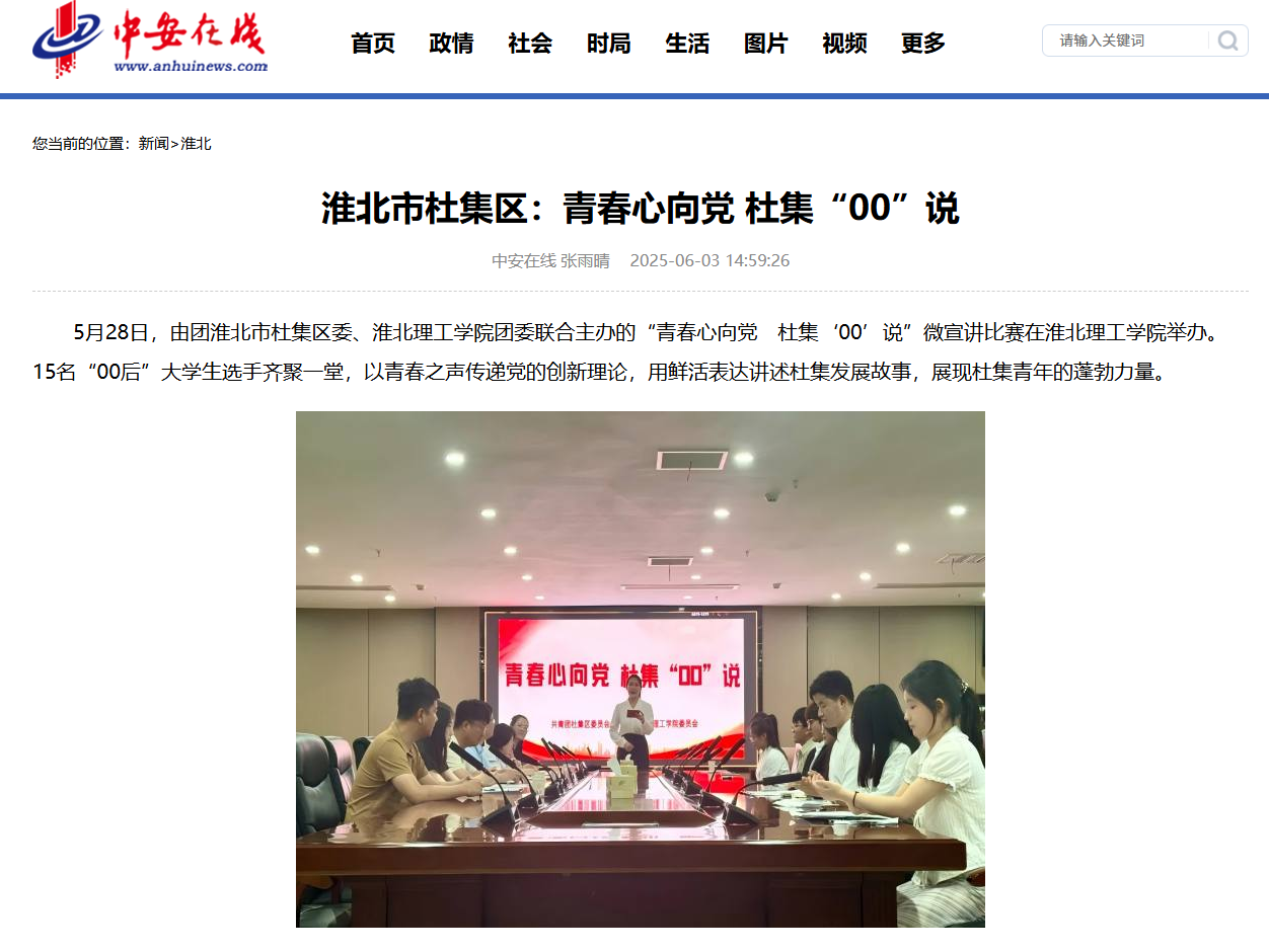 5月28日,由团淮北市杜集区委、beat365英国官方网站团委联合主办的“青春心向党 杜集‘00’说”微宣讲比赛在beat365英国官方网站举办。15名“00后”大学生选手齐聚一堂,以青春之声传递党的创新理论,用鲜活表达讲述杜集发展故事,展现杜集青年的蓬勃力量。对此,中安在线进行了报道: