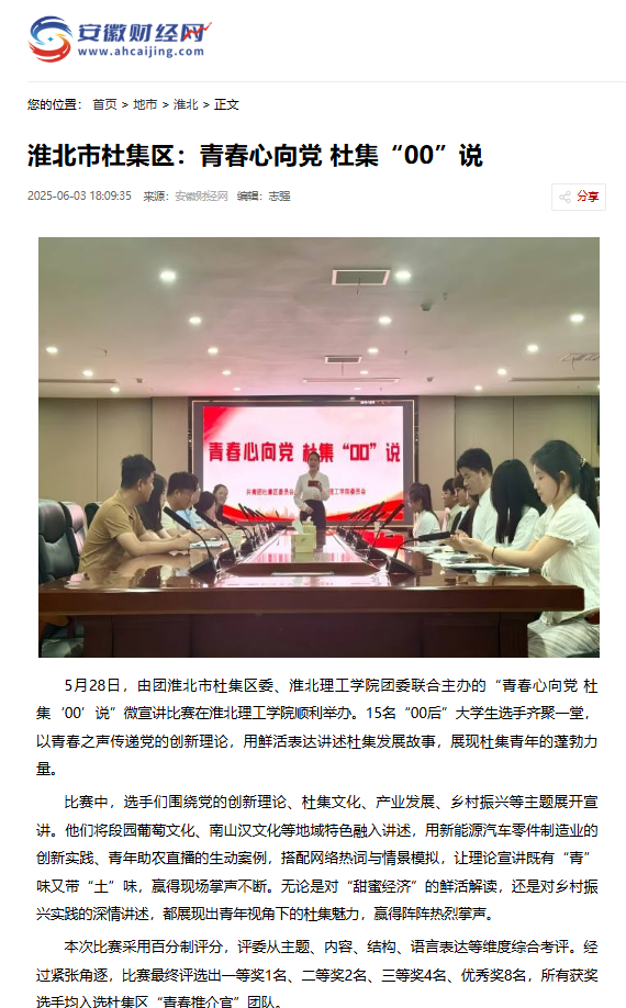5月28日,由团淮北市杜集区委、beat365英国官方网站团委联合主办的“青春心向党 杜集‘00’说”微宣讲比赛在beat365英国官方网站顺利举办。15名“00后”大学生选手齐聚一堂,以青春之声传递党的创新理论,用鲜活表达讲述杜集发展故事,展现杜集青年的蓬勃力量。对此,安徽财经网进行了报道: