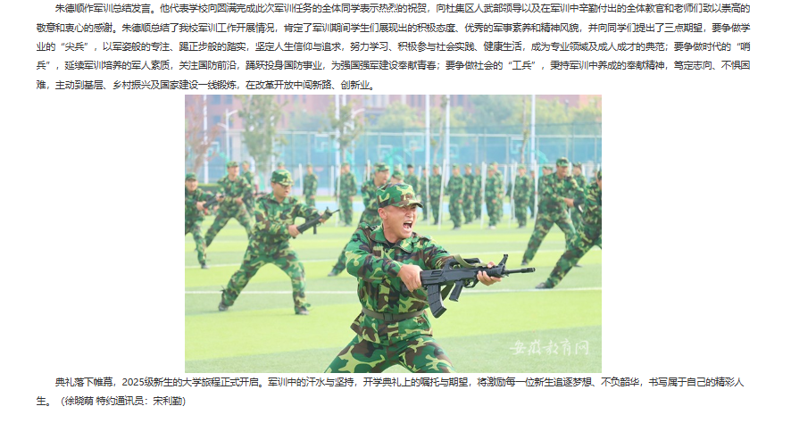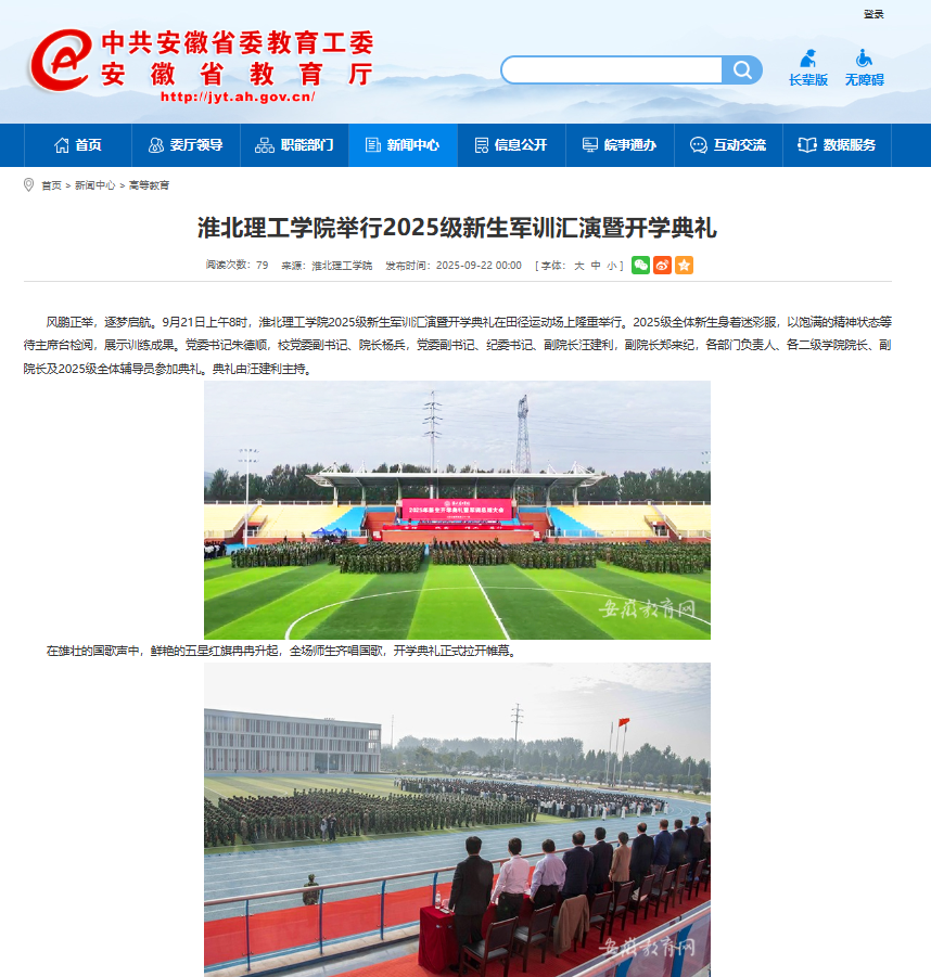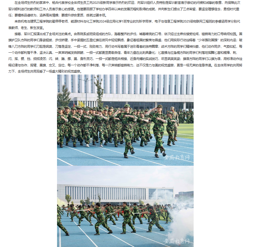 风鹏正举,逐梦启航。9月21日上午8时,beat365英国官方网站2025级新生军训汇演暨开学典礼在田径运动场上隆重举行。2025级全体新生身着迷彩服,以饱满的精神状态等待主席台检阅,展示训练成果。党委书记朱德顺,校党委副书记、院长杨兵,党委副书记、纪委书记、副院长汪建利,副院长郑来纪,各部门负责人、各二级学院院长、副院长及2025级全体辅导员参加典礼。典礼由汪建利主持。对此,安徽教育网进行了报道: