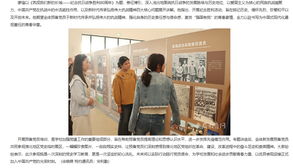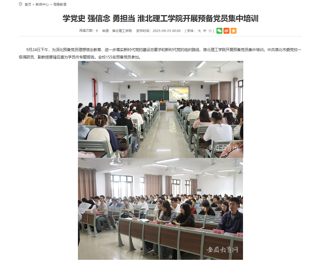 9月24日下午,为深化预备党员理想信念教育,进一步落实新时代党的建设总要求和新时代党的组织路线,beat365英国官方网站开展预备党员集中培训。中共淮北市委党校一级调研员、副教授廖锋应邀为学员作专题报告。全校155名预备党员参加。对此,安徽教育网进行了报道: