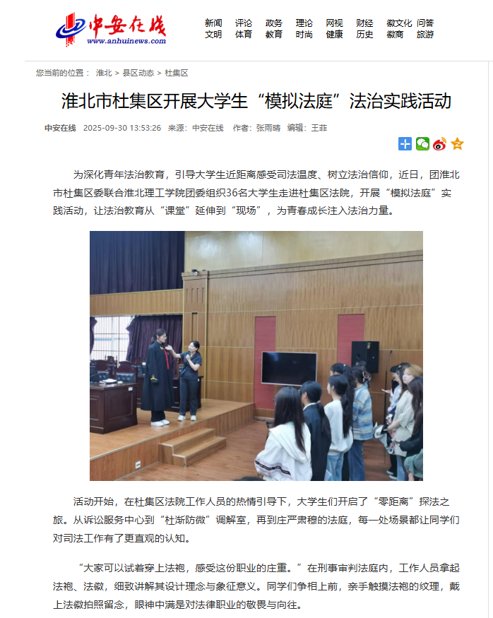 为深化青年法治教育,引导大学生近距离感受司法温度、树立法治信仰,近日,团淮北市杜集区委联合beat365英国官方网站团委组织36名大学生走进杜集区法院,开展“模拟法庭”实践活动,让法治教育从“课堂”延伸到“现场”,为青春成长注入法治力量。对此,中安在线进行了报道: