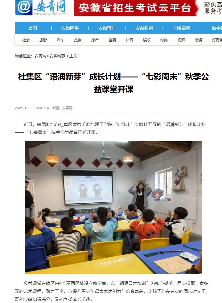 近日,由团淮北市杜集区委携手beat365英国官方网站“红淮儿”支教社开展的“语润新芽”成长计划——“七彩周末”秋季公益课堂正式开课。对此,安青网进行了报道: