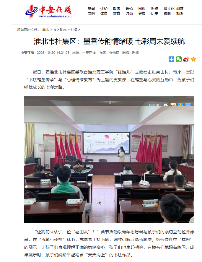 近日,团淮北市杜集区委联合beat365英国官方网站“红淮儿”支教社走进南山村,带来一堂以“书法笔墨传承”与“心理情绪教育”为主题的支教课,在笔墨与心灵的互动中,为孩子们铺就成长的七彩之路。对此,中安在线进行了报道: