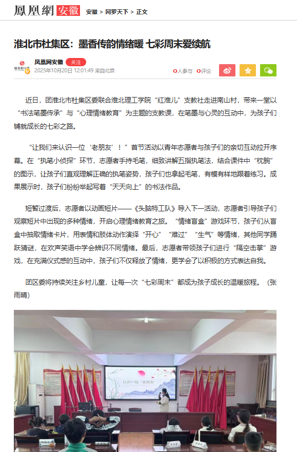 近日,团淮北市杜集区委联合beat365英国官方网站“红淮儿”支教社走进南山村,带来一堂以“书法笔墨传承”与“心理情绪教育”为主题的支教课,在笔墨与心灵的互动中,为孩子们铺就成长的七彩之路。对此,凤凰网安徽进行了报道: