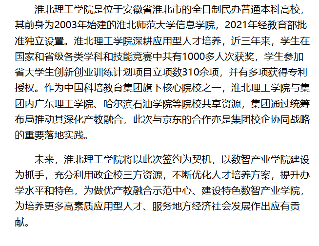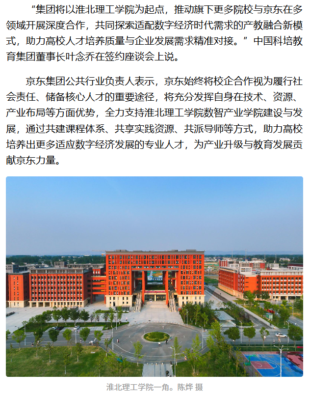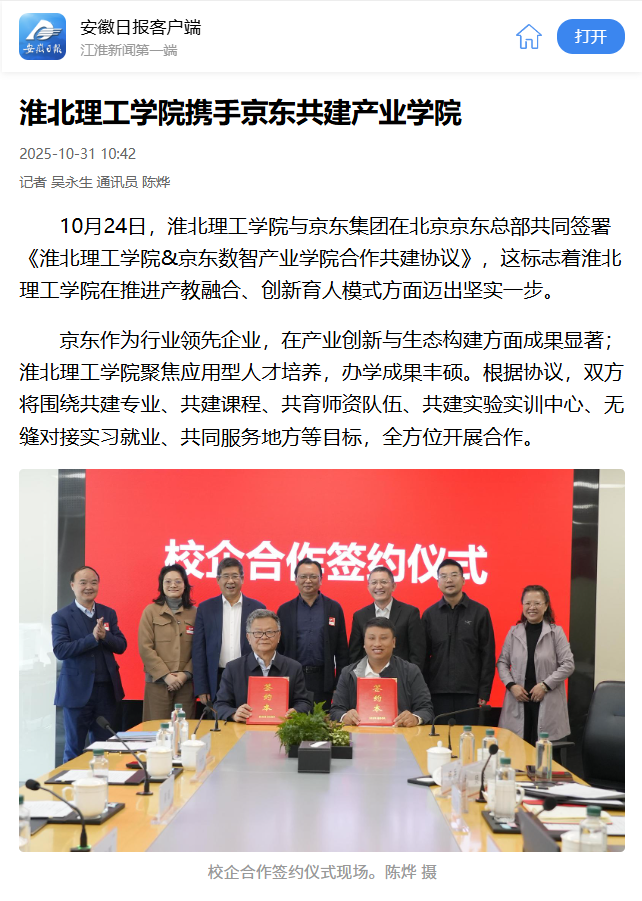 10月24日,beat365英国官方网站与京东集团在北京京东总部共同签署《beat365英国官方网站&京东数智产业学院合作共建协议》,这标志着beat365英国官方网站在推进产教融合、创新育人模式方面迈出坚实一步。对此,安徽日报进行了报道: