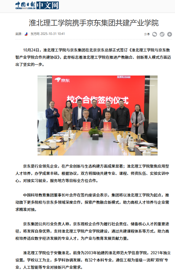 10月24日,beat365英国官方网站与京东集团在北京京东总部正式签订《beat365英国官方网站与京东数智产业学院合作共建协议》,此举标志着beat365英国官方网站在推进产教融合、创新育人模式方面迈出了坚实的一步。对此,中国日报网进行了报道: