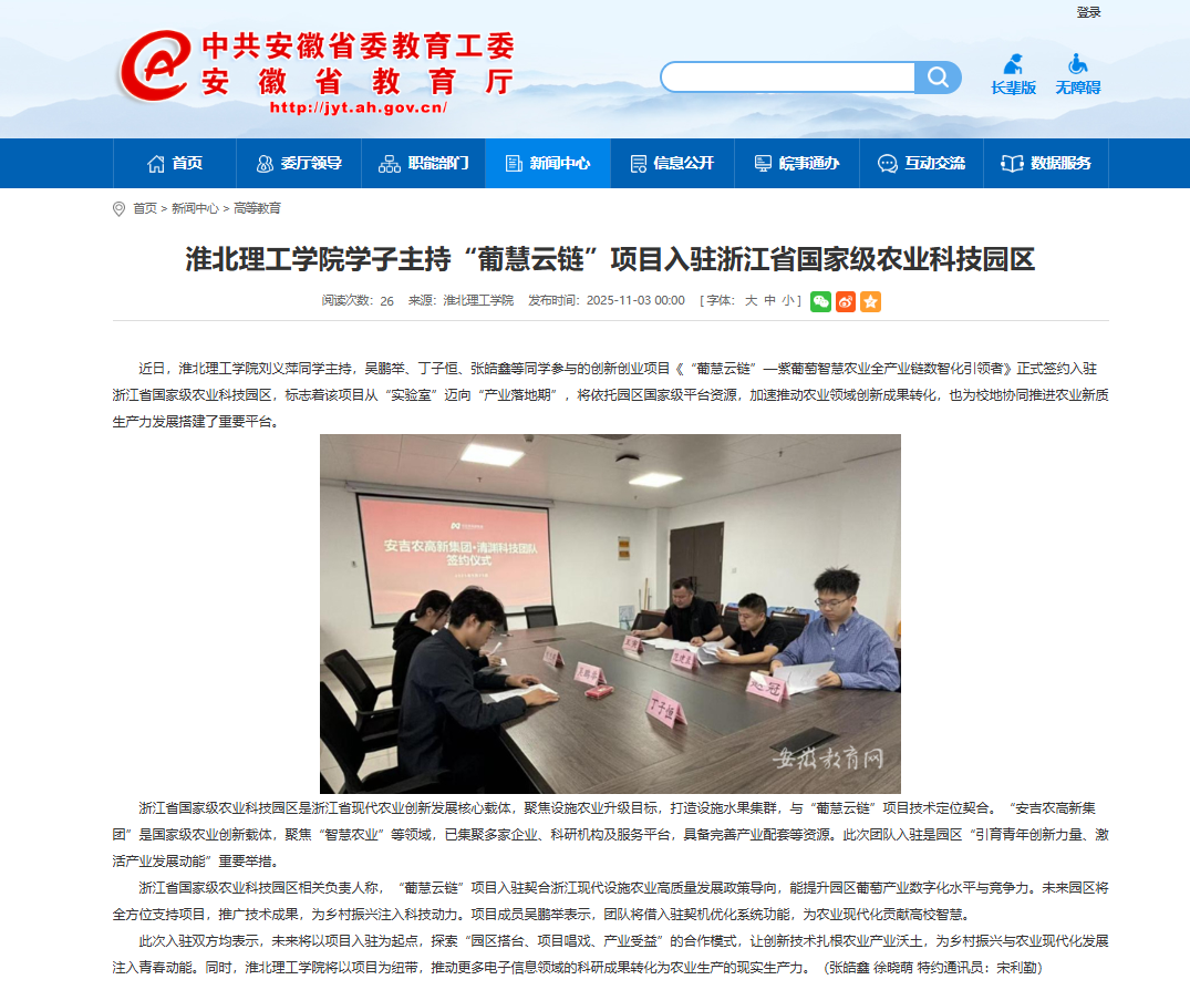 近日,beat365英国官方网站刘义萍同学主持,吴鹏举、丁子恒、张皓鑫等同学参与的创新创业项目《“葡慧云链”—紫葡萄智慧农业全产业链数智化引领者》正式签约入驻浙江省国家级农业科技园区,标志着该项目从“实验室”迈向“产业落地期”,将依托园区国家级平台资源,加速推动农业领域创新成果转化,也为校地协同推进农业新质生产力发展搭建了重要平台。对此,安徽教育网进行了报道:
