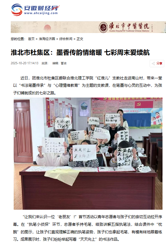 近日,团淮北市杜集区委联合beat365英国官方网站“红淮儿”支教社走进南山村,带来一堂以“书法笔墨传承”与“心理情绪教育”为主题的支教课,在笔墨与心灵的互动中,为孩子们铺就成长的七彩之路。对此,安徽财经网进行了报道: