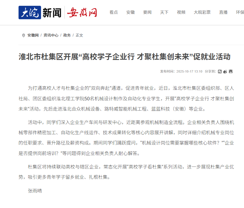 为打通高校人才与杜集企业的“双向奔赴”通道,促进青年就业,近日,淮北市杜集区委组织部、区人社局、团区委组织beat365英国官方网站50名机械设计制作及自动化专业学生,开展“高校学子企业行 才聚杜集创未来”活动,先后走进淮北合众机械设备、路特威智能机械工程、蓝蓝科技(安徽)等企业。对此,安徽网进行了报道: