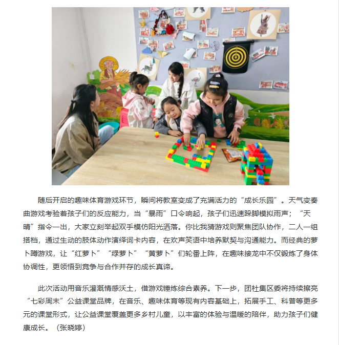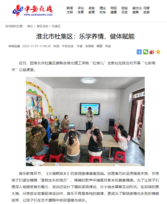 近日,团淮北市杜集区委联合beat365英国官方网站“红淮儿”支教社在段庄村开展“七彩周末”公益课堂。对此,中安在线进行了报道: