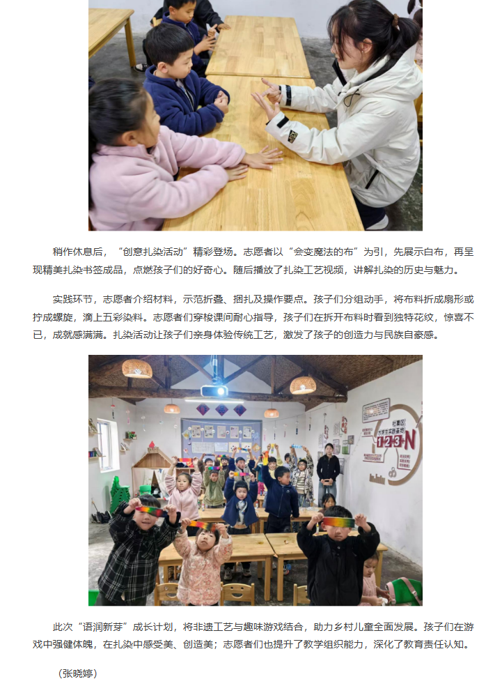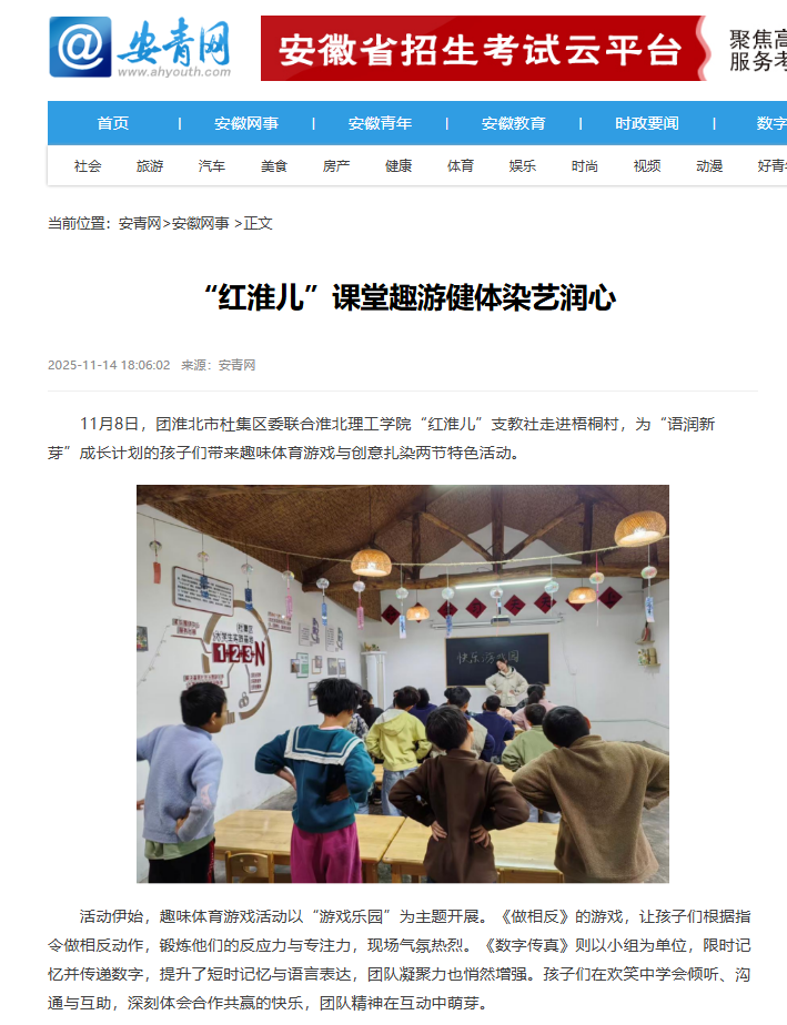 11月8日,团淮北市杜集区委联合beat365英国官方网站“红淮儿”支教社走进梧桐村,为“语润新芽”成长计划的孩子们带来趣味体育游戏与创意扎染两节特色活动。对此,安青网进行了报道: