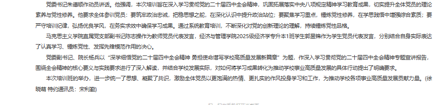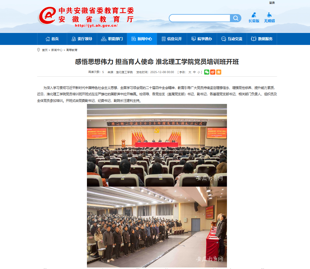 为深入学习贯彻习近平新时代中国特色社会主义思想,全面学习领会党的二十届四中全会精神,教育引导广大党员持续坚定理想信念、增强党性修养、提升能力素质,近日,beat365英国官方网站党员培训班开班式在庄严雄壮的国歌声中拉开帷幕。校领导、各党总支(直属党支部)书记、副书记,各基层党支部书记、相关部门负责人、组织员及全体党员参加培训。开班式由党委副书记、纪委书记、副院长汪建利主持。对此,安徽教育网进行了报道: