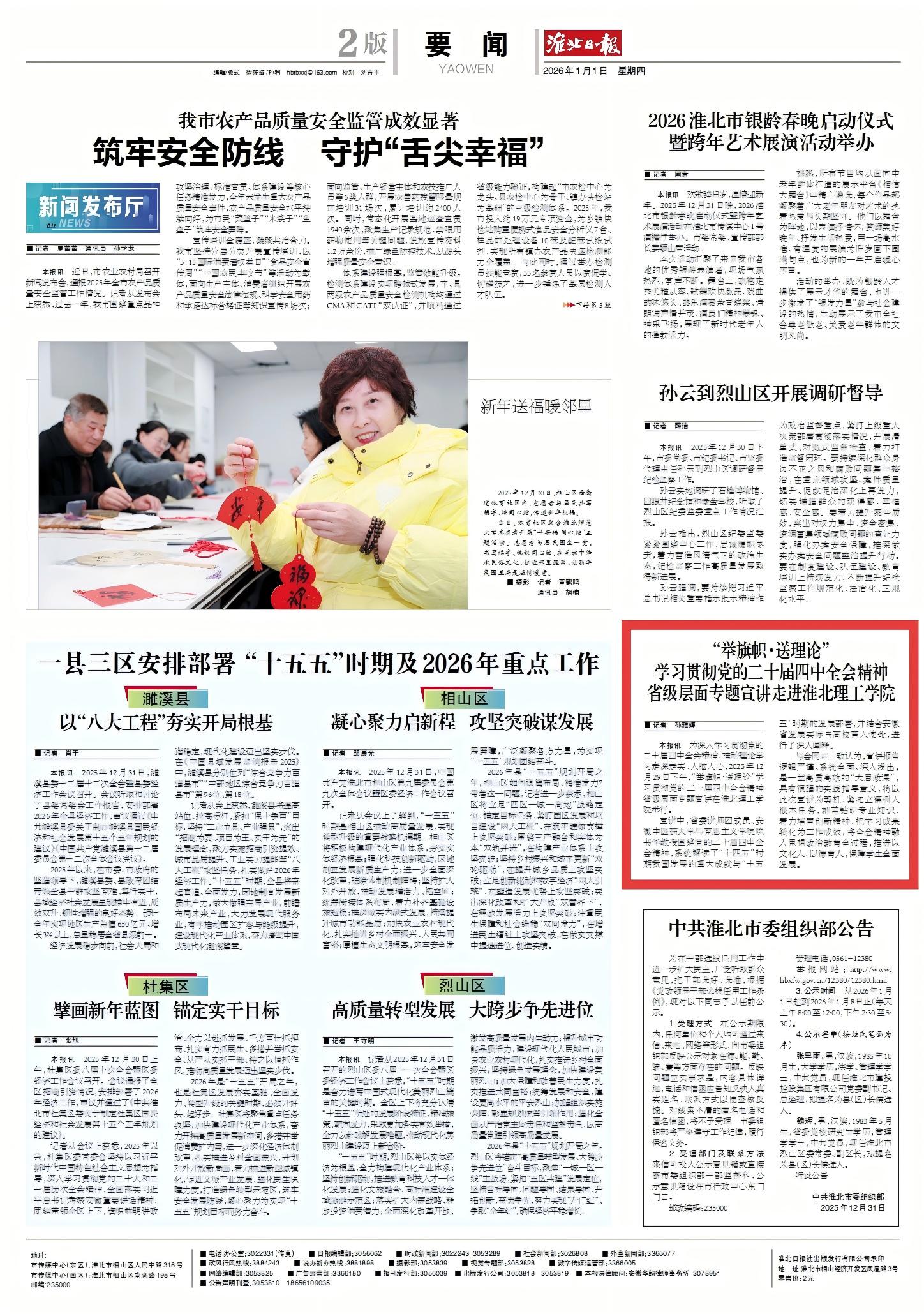 为深入学习贯彻党的二十届四中全会精神,推动理论学习走深走实、入脑入心,2025年12月29日下午,“举旗帜·送理论”学习贯彻党的二十届四中全会精神省级层面专题宣讲在beat365英国官方网站举行。对此,淮北日报进行了报道: