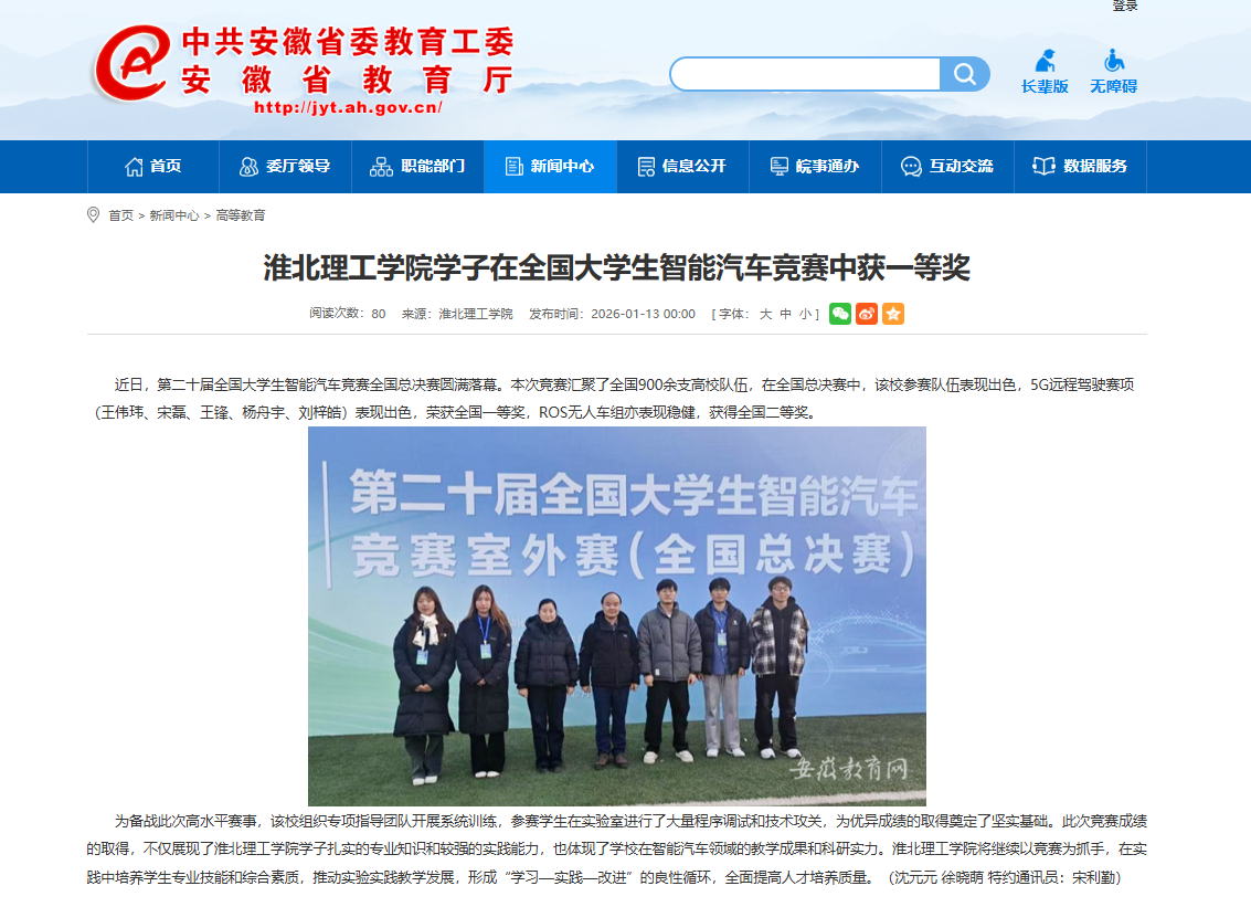 近日,第二十届全国大学生智能汽车竞赛全国总决赛圆满落幕。本次竞赛汇聚了全国900余支高校队伍,在全国总决赛中,该校参赛队伍表现出色,5G远程驾驶赛项(王伟玮、宋磊、王锋、杨舟宇、刘梓皓)表现出色,荣获全国一等奖,ROS无人车组亦表现稳健,获得全国二等奖。对此,安徽教育网进行了报道: